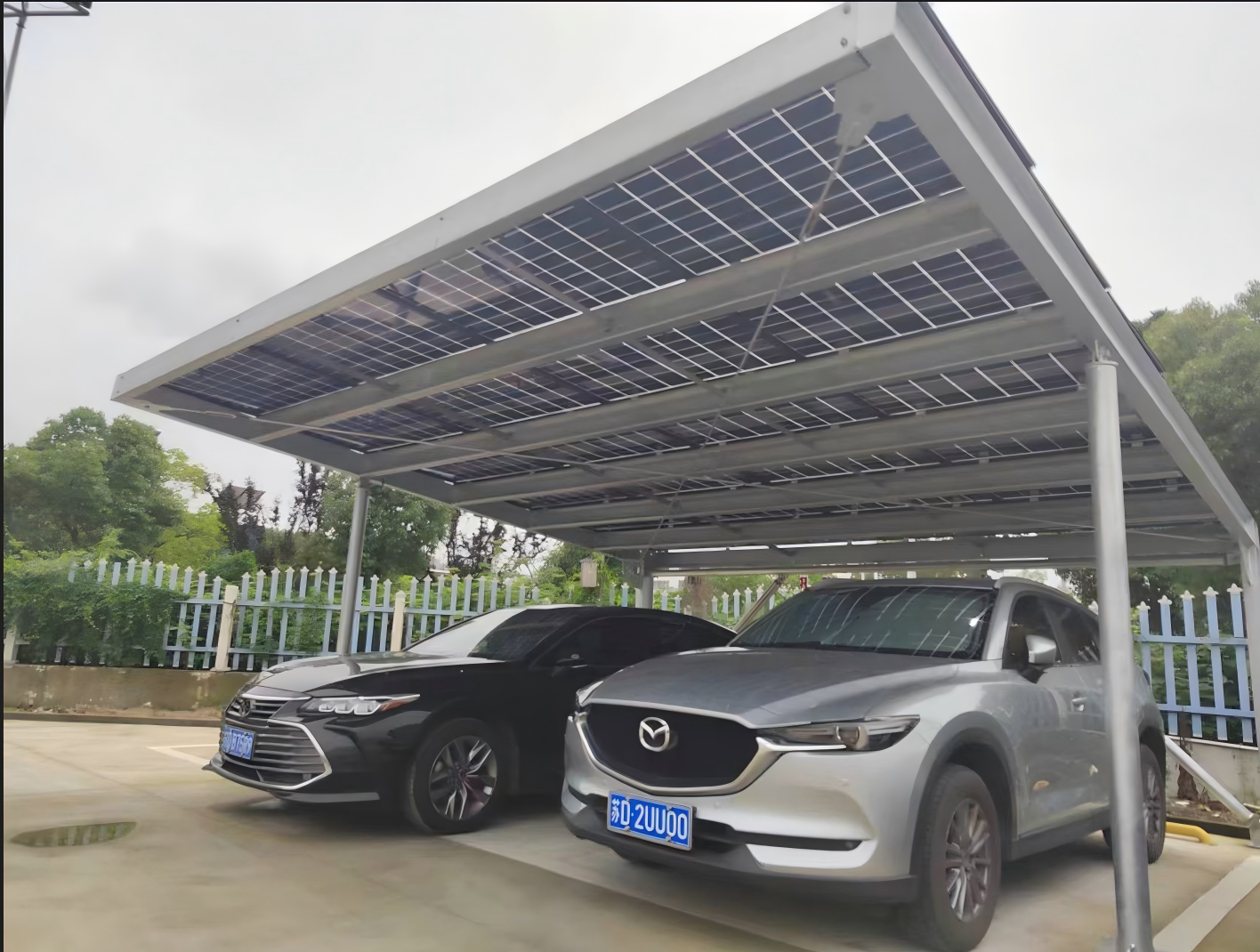 The Lightweight Photovoltaic Double Carport is an advanced, dual-vehicle solar shelter engineered for efficiency and durability. Constructed with high-strength aluminum or composite materials, its lightweight yet robust structure allows for easier installation and reduced load on the ground, while still withstanding harsh weather conditions. The roof is seamlessly integrated with high-efficiency photovoltaic panels, which convert sunlight into electricity to power homes, facilities, or electric vehicle chargers.